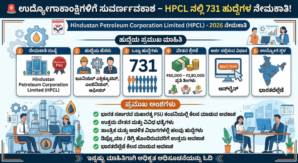 ಉದ್ಯೋಗಾಕಾಂಕ್ಷಿಗಳಿಗೆ ಸುವರ್ಣಾವಕಾಶ! ಹಿಂದುಸ್ತಾನ್ ಪೆಟ್ರೋಲಿಯಂ ಕಾರ್ಪೊರೇಷನ್ ಲಿಮಿಟೆಡ್ (HPCL) 2026ನೇ ಸಾಲಿನ ನೇಮಕಾತಿಗಾಗಿ ಅಧಿಕೃತವಾಗಿ ಸೂಚನೆ ಪ್ರಕಟಿಸಿದೆ. ವಿವಿಧ ತಾಂತ್ರಿಕ ಮತ್ತು ಆಡಳಿತ ವಿಭಾಗಗಳಲ್ಲಿ ಒಟ್ಟು 731 ಎಂಜಿನಿಯರ್ ಹಾಗೂ ಆಫೀಸರ್ ಹುದ್ದೆಗಳನ್ನು ಭರ್ತಿ ಮಾಡಲು ಅಧಿಕೃತ ಅಧಿಸೂಚನೆ ಬಿಡುಗಡೆ ಮಾಡಿದೆ.